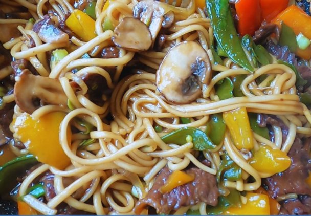 Makaron Udon - gotujemy wg zaleceń producenta. Pieczarki i paprykę kroimy w większe kawałki. Cebulę w pióra. Czosnek przeciskamy przez praskę. Wołowinę kroimy w cienkie, mniejsze kawałki. Przyprawiamy dodając sos ostrygowy ok 70 ml, sos sojowy - 4 łyżki i mąkę. Mieszamy całość (Wołowina jest już przygotowana). Na patelnie wlewamy olej i rozgrzewamy. Potem dodajemy (cały czas całość mieszajcie): - groszek cukrowy - smażymy ok 2 min, - wołowinę - smażymy - ok 4-5 min, - cebulę - 2 min - paprykę, paprykę, czosnek, wlewamy sos ostrygowy i sos sojowy (czekamy aż papryka i pieczarki delikatnie zmiękną. - makaron Udon - na koniec cebulkę zieloną. (Smażymy całość jeszcze chwilę, najważniejsze, żeby nie rozgotować warzyw bo będą mniej smaczne). I nasze szybkie danie jest już gotowe! Film do przepisu znajdziecie poniżej. Życząc smacznego pozdrawiam serdecznie!!!