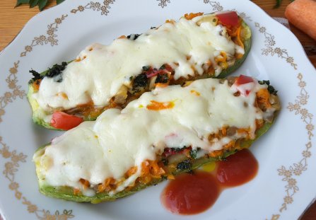Do każdej połówki cukinii wsyp tylko odrobinę startego sera, następnie wypełnij farszem. Brzegi posmaruj olejem, ułóż cukinie na blaszce piekarnika wyłożonej papierem do pieczenia i wstaw do piekarnika rozgrzanego do 200 stopni Celsjusza. Piecz ok. 40 minut, aż cukinia zmięknie.