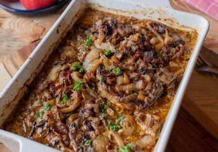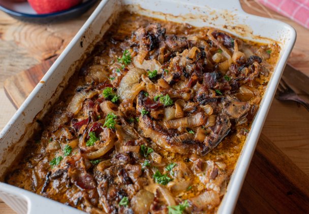 Zapiekana karkówka w sosie cebulowym to danie, które łączy mięso z delikatnym słodkim smakiem. Ma też orientalną nutę dzięki dodatkowi sosu sojowego oraz octu ryżowego.
