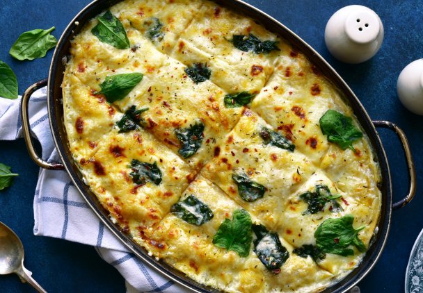 Zapiekane naleśniki z kurczakiem to efektowne i sycące danie podane pod pierzynką śmietanową z serem. Po zapieczeniu w piekarniku całość nabiera złotej skórki, a w środku farsz pozostaje soczysty, a naleśniki miękkie.