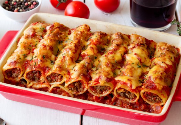 Zapiekane roladki naleśnikowe w stylu przypominającym cannelloni to połączenie delikatnych naleśników, aromatycznego farszu mięsno-serowego i soczystego sosu pomidorowego. To wszystko jest podane z zapieczonym, ciągnącym się serem i nutą tymianku lub oregano. Sprawdź, jak zrobić to danie, nawiązujące do włoskiego klasyka.