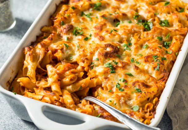 Makaronowa zapiekanka resztkowa z produktów, które zalegają w lodówce - w tym przypadku jest to szynka, pomidory, cebula i ser żółty. Jej smak można wzbogacić o dowolne warzywa - paprykę, cukinię, brokuła czy bakłażana. Jest niesamowicie prosta i szybka do przygotowania, a do tego bardzo smaczna i sycąca.