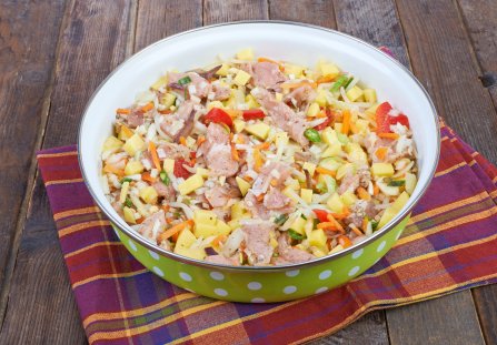 Ziemniaki ugotuj w mundurkach, ostudź je i pokrój w niewielką kostkę. Wieprzowinę pokrój lub poszarp widelcami.