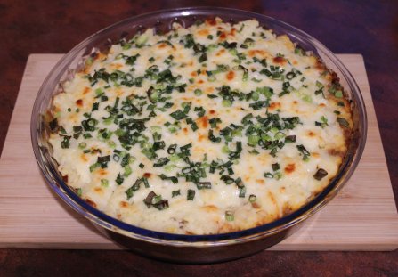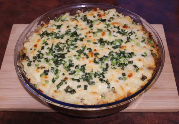 Na mięso wyłożyć ziemniaki. Na ziemniaki starty ser żółty. Całość posypać posiekanym szczypiorkiem.