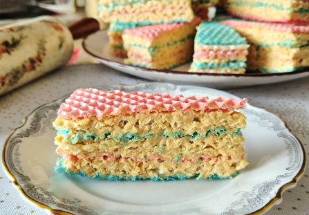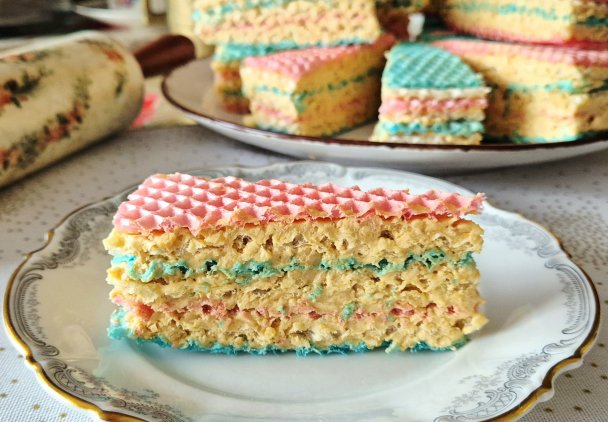 Układamy pierwszy wafel na talerzu i smarujemy go dwiema czubatymi łyżkami kremu. Posypujemy orzeszkami, które lekko wciskamy w krem. Nakładamy następny wafel i powtarzamy czynności, aż do wyczerpania składników. Nasze wafle są kolorowe i układałyśmy je naprzemiennie kolorami.