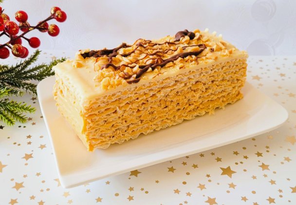 Ostatni wafel ma być suchy. Kładziemy na niego kolejną deseczkę. Przyciskamy ciężkim przedmiotem (ale bez przesady) i wkładamy do lodówki na kilka godzin, a najlepiej na całą noc.
