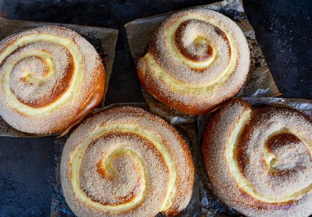 Przygotuj bułeczki. Zagnieć ponownie ciasto i rozwałkuj je na prostokątny placek o grubości ok. 1,5 cm. Posmaruj go nadzieniem śmietankowym, pozostawiając ok. 1 cm wolnego miejsca z brzegu. Zwiń całość w rulon i zlep brzegi. Odstaw na ok. 20 minut do wyrośnięcia.