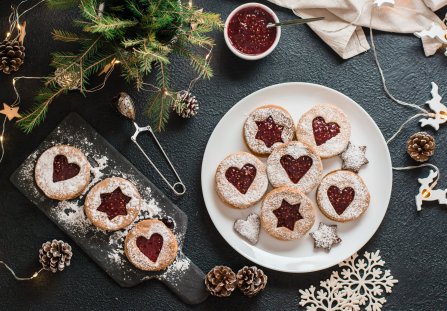 Dżem lekko podgrzej, aby był bardziej płynny. Pełne ciasteczka posmaruj cienką warstwą gorącego dżemu. Przykryj ciasteczkami z dziurką, delikatnie dociskając.