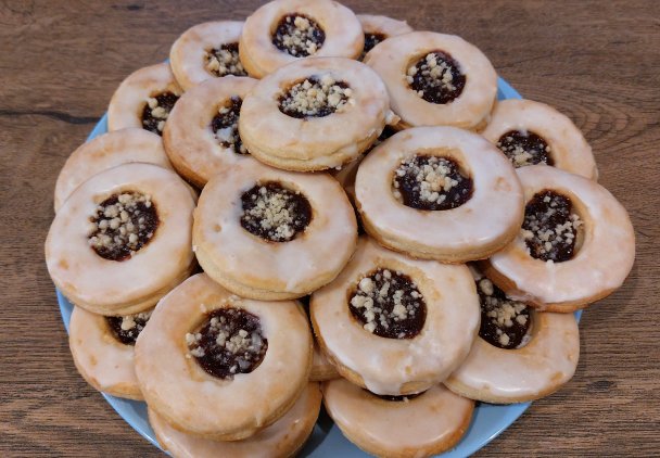 Pyszne drożdżowe ciasteczka z powidłami, lukrem i kruszonką.
