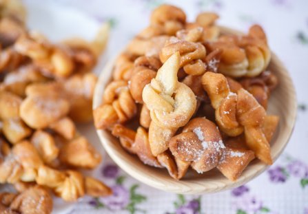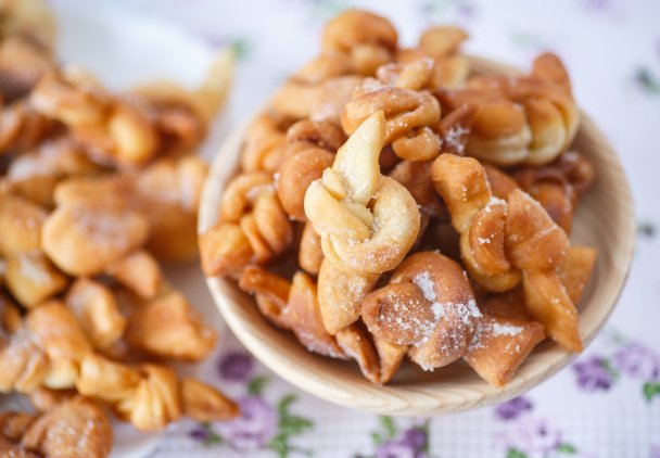 Ciastka gęsie dzióbki znane też jako gęsie pępki lub drobny chrust to klasyczne karnawałowe wypieki smażone na głębokim tłuszczu. Charakteryzują się nieregularnym kształtem małych kokardek i wyjątkową chrupkością. Posypane cukrem pudrem będą idealną słodką przekąską czy poczęstunkiem na Tłusty Czwartek. Świetnie pasują do kawy lub herbaty.