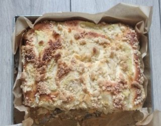 po upływie 1,30 minut dokładnie wymieszać, zrobić kruszonkę z 1/2 kostki masła lub margaryny, 1 szklanki cukru i 1 szklanki mąki