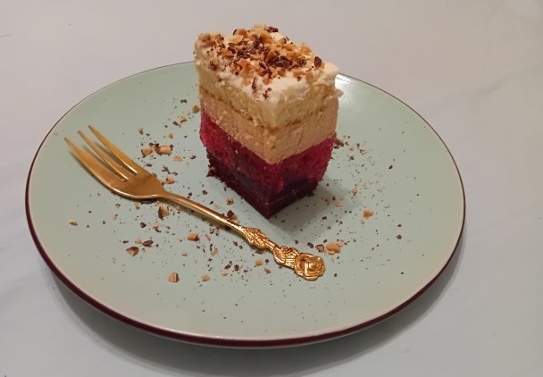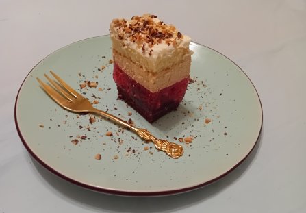 Smaczne i lekkie ciasto z malinami,galaretką z kremem cappucino. Przepisna blachę 24x24cm.
