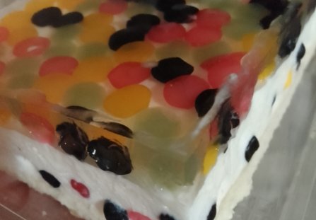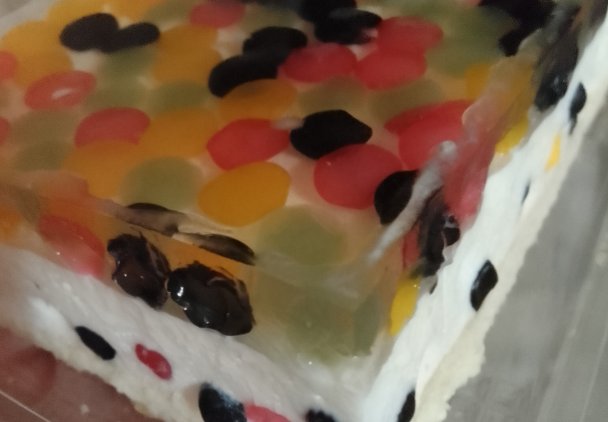 Żelatynę rozpuścić w gorącej wodzie wymieszaj dokładnie. Śmietankę ubić na sztywno z cukrem pudrem, dodać serek waniliowy, wymieszać i dodać żelatynę, ponownie wymieszać. Do kremu dodać połowę jagód. Krem nałożyć na biszkopt, wyrównać powierzchnię i schłodzić. Rozpuścić w gorącej wodzie galaretkę. Wystudzić i połączyć z pozostałymi jagodami. Tężejącą nałożyć na wierzch ciasta.