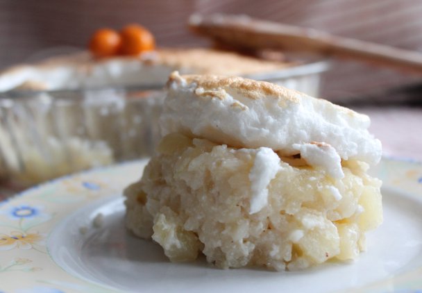 Deser, który z powodzeniem może zastąpić kolację. Najlepiej smakuje jeszcze gorący. Mleczny, słodki ryż z jabłkiem i rodzynkami przykryty jest miękką poduszeczką z ubitych białek.