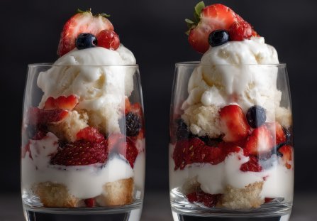 Na spód szklanek wyłóż pokruszone biszkopty i truskawki. Składniki przykryj bitą śmietaną. Na bitą śmietanę wyłóż wymieszane owoce. Przykryj je kolejną warstwą pokruszonych biszkoptów. Na górze umieść po gałce lodów waniliowych. Deserki udekoruj owocami.