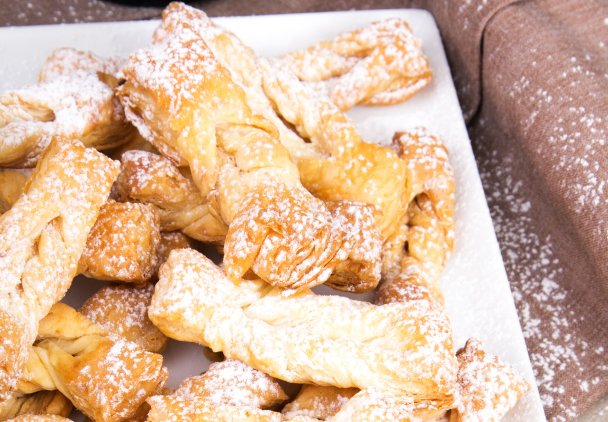 Rozwiń arkusz ciasta francuskiego. Pokrój go na paski o szerokości około 3 cm. Na środku każdego paseczka zrób nacięcie na około 5 cm długości. Przez nacięty otwór przełóż jeden koniec ciasta.