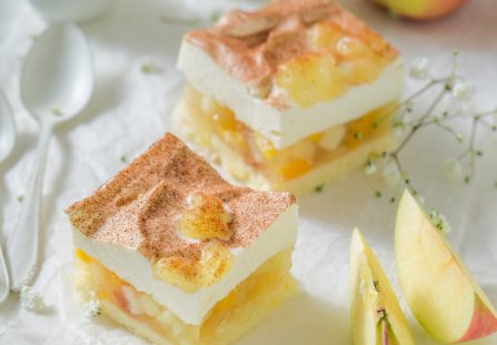 Złóż jabłecznik. Na biszkopcie rozsmaruj tężejącą masę jabłkową, wyrównaj. Następnie wyłóż warstwę bitej śmietany, również wyrównaj. Wstaw do lodówki na kilka godzin.