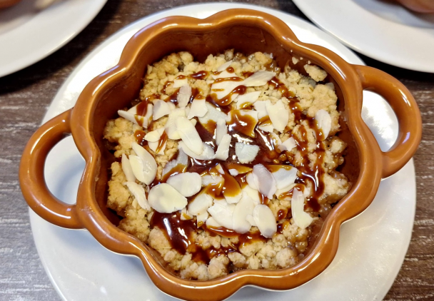 Przełóż jabłka do naczynia żaroodpornego do 2/3 wysokości i przykryj kruszonką, lekko dociśnij.
