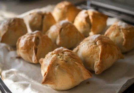 Ułóż jabłka w cieście na blasze wyłożonej papierem do pieczenia. Wstaw do piekarnika. Piecz przez około 20 minut – aż ciasto się zarumieni.