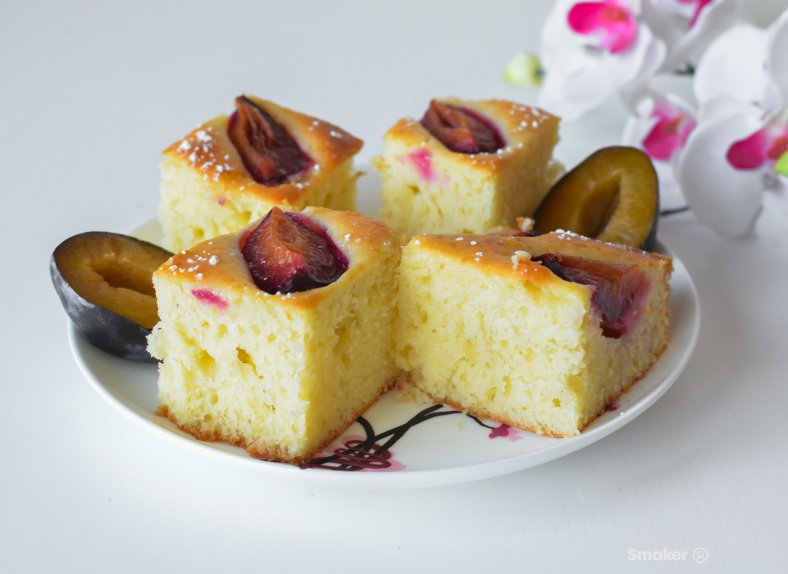 Brytfankę o wymiarach 24x24 smarujemy tłuszczem i oprószamy mąką bądź wykładamy do pieczenia. Przelewamy ciasto. Obrane i umyte śliwki kroimy na kawałki i układamy na wierzchu ciasta delikatnie wciskając w masę. Pieczemy 40 minut w temperaturze 180 stopni. Po wystudzeniu posypujemy cukrem pudrem.