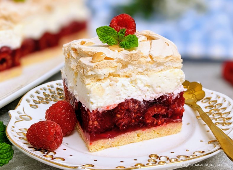 Malinowa chmurka to bardzo pyszne i dekoracyjne ciasto, nadaje się do niedzielnej kawy, na świąteczny stół, ale również może być w formie tortu. Cztery warstwy różnych smaków idealnie ze sobą współgrają. Kruche ciasto, maliny w galaretce, delikatny krem waniliowy a na samej górze chrupiącą beza- to jak wisienka na torcie. Ciasto wymaga czasu,ale wszystkie kroki są bardzo proste i szybko się je przygotowuje. Malinowa chmurka będzie pięknie zdobić Wielkanocy stół.