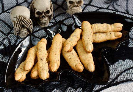Kruche, mocno maślane ciasteczka w Halloweenowym klimacie. Paluchy Wiedźmy, ale z dodatkiem mielonych migdałów. Ciasteczka są proste i pyszne.