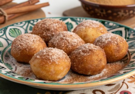 Jeszcze ciepłe pączusie jabłkowe obtocz w cukrze z cynamonem.