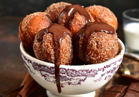 Jeśli lubisz słodsze desery, możesz udekorować pączki polewą czekoladową. Podgrzej odrobinę śmietanki w garnku i dodaj pokruszoną gorzką czekoladę. Cały czas mieszaj - jeśli polewa jest za gęsta, dodaj więcej śmietanki, gdy za rzadka - więcej czekolady. Gotową polej minipączki i odstaw do zastygnięcia.