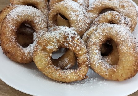 wszystkie składniki należy połączyć ze sobą i rozwałkować ciasto na około pół centymetra i wykrawać szklanką kółka a środki kieliszkiem. na rozgrzany tłuszcz wrzucamy oponki i smażymy z obu stron po wystudzeniu możemy oprószyć cukrem pudrem smacznego.