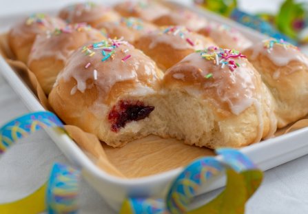 Pączki bez smażenia - pieczone w piekarniku. Proste w przygotowaniu, cudownie puszyste, zdecydowanie mniej kaloryczne od tradycyjnych pączków smażonych na głębokim tłuszczu. Nadziane domową konfiturą smakują rewelacyjnie.