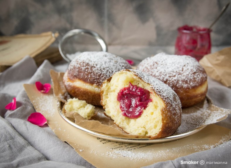 Z wyrośniętego ciasta odrywać kawałki wielkości jajka, formować okrągłe pączki, układać na wysmarowanej olejem blasze, przykryć i pozostawić do napuszenia na ok 30 minut. W rondlu z grubym dnem rozgrzać olej do 170stC. Na olej wykładać pączki wyrośniętą stroną, smażyć ok 1,5 minuty na małym ogniu, odwrócić i smażyć jeszcze ok minuty (czas smażenia zależy od wielkości pączków). Usmażone pączki wyjąć, położyć na papierowym ręczniku, żeby osączyć je z nadmiaru tłuszczu. Gdy nieco przestygną, nadziać kremem za pomocą szprycy z długą końcówką-rurką. Oprószyć cukrem pudrem. Smacznego!