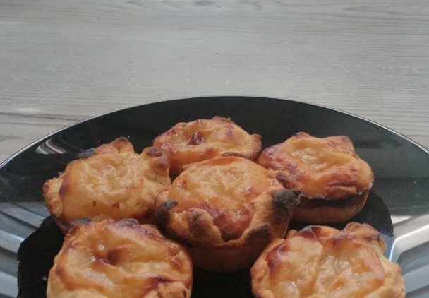 Przygotować formę do babeczek – o standardowej wielkości. Z pokrojonego ciasta francuskiego wycinać kółka o średnicy nieco większej niż średnica gniazd, tak by ciasto po wyłożeniu zajęło dno i boki foremek. Do gniazdek z ciasta przelewać mieszankę, nalewając ją do 3/4 wysokości boków ciasta