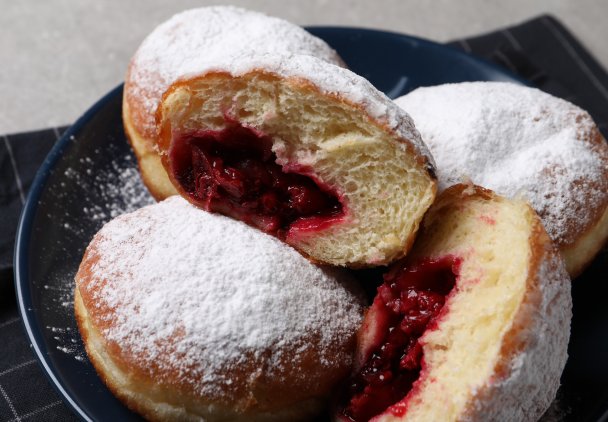 Przed podaniem usmażone, nadziane pączki oprósz cukrem pudrem.