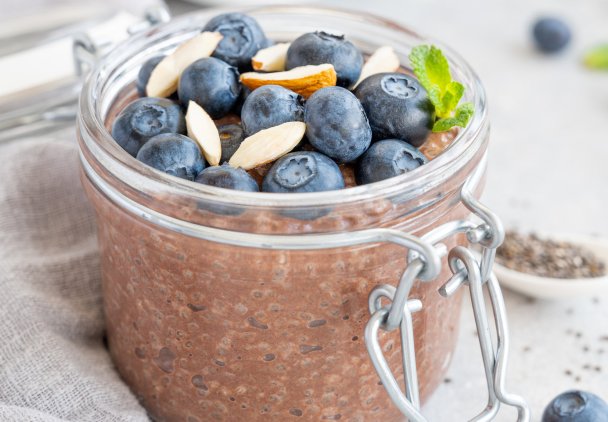 Gotowy pudding czekoladowy z chia przelej do szklanek. Udekoruj owocami i orzechami.