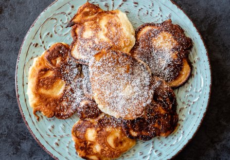 Gotowe racuchy oprósz cukrem pudrem lub polej płynnym miodem. Smacznego!