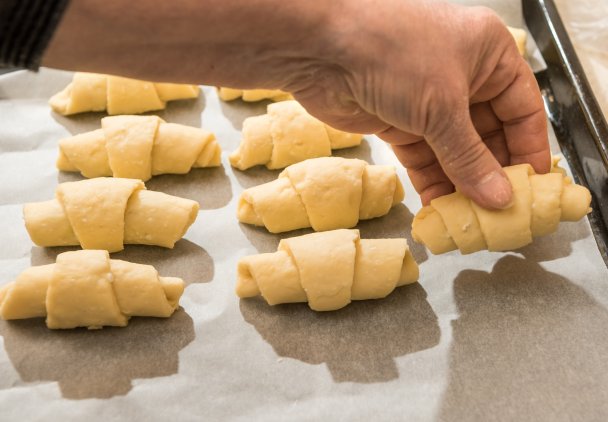 Blachę piekarnika wyściel papierem do pieczenia. Rogaliki układaj na blaszce w równych odstępach. Gotowe rogaliki posmaruj rozbełtanym białkiem.