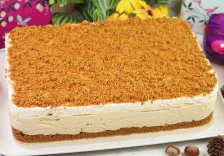 Przygotuj ciasteczkowy spód. Do dużego woreczka strunowego przełóż 250 g korzennych ciastek. Woreczek strunowy zamknij prawie całkowicie; zostawiając około centymetrową szparę, przez którą będzie mogło uciekać powietrze. Ciastka rozbij przy pomocy wałka do uzyskania drobnego pyłu. Jeśli chcesz, spód deseru możesz też przygotować w malakserze. Po rozbicu ciastek w drobny pył dodaj do nich 100 g rozpuszczonego i wystudzonego masła. Zawartość woreczka krótko przegnieć, do równego rozprowadzenia tłuszczu w ciastkach i uzyskania konsystencji mokrego piasku.