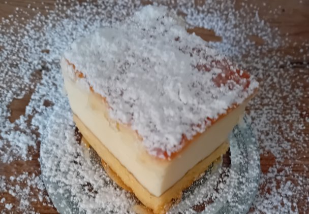 Po 40 minutach wyjąć sernik,wylać na wierzch biszkopt,piec jeszcze 20 minut. Po ostudzeniu ciasto odwrócić, posypać cukrem pudrem.