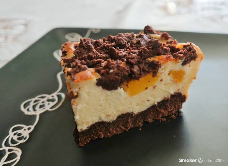 Ser utrzeć z cukrem dodawać pomału roztopioną Kasię, następnie budyń i kasze mannę na koniec ubita piane i delikatnie wymieszać. Ser wyłożyć na ciasto na to ułożyć pokrojone w kostkę brzoskwinie, zetrzeć pozostałe ciasto bądź też je po prostu urywać kawałkami. Piec 60min.