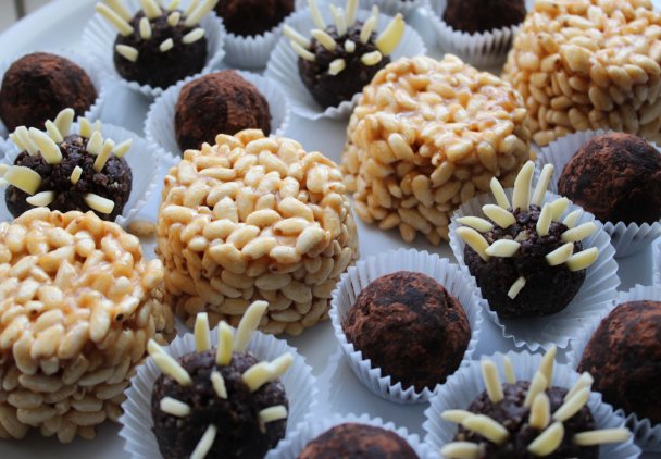 trufle i kasztany: Mleko z masłem podgrzać w rondelku. Dodać pokruszoną czekoladę i rozpuścić stale mieszając. Następnie zdjąć z ognia. Wsypać orzechy i wymieszać. Poczekać aż masa lekko przestygnie. Formować kulki. Trufle obtaczać w kakao, a kasztany naszpikować migdałami.