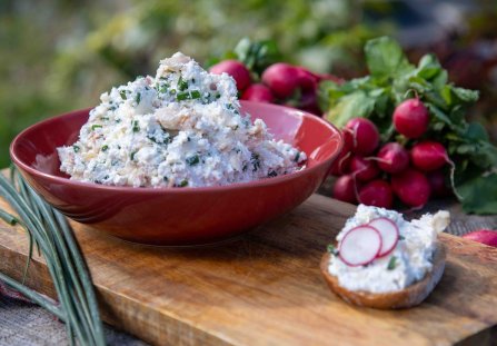 Podawać na pieczywie. Udekorować szczypiorkiem i plastrami rzodkiewki.