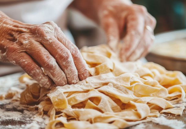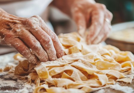 Żółciutki, domowy makaron z przepisu babci. W zależności od sposobu krojenia możemy wykorzystać go jako dodatek do zupy lub bazę do dań z aromatycznymi sosami. Do przygotowania domowego makaronu najlepiej wykorzystać najwyższej jakości jajka ekologiczne oraz drobno zmieloną mąkę pszenną - typ 450 lub 500 sprawdzą się tutaj idealnie.