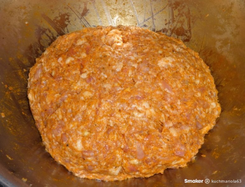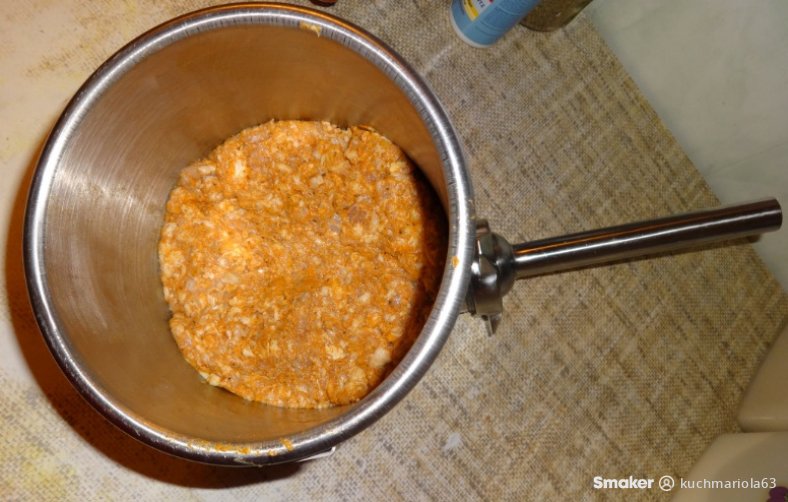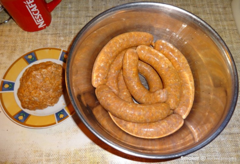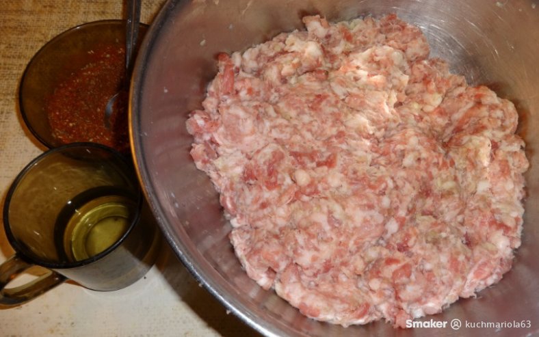 Mięsa mielimy razem z czosnkiem przez sitko 5 mm. Do zmielonego mięsa dodajemy wszystkie suche przyprawy, sól i ocet jabłkowy, dobrze wyrabiamy przez około 10 minut do dobrego połączenia się składników.