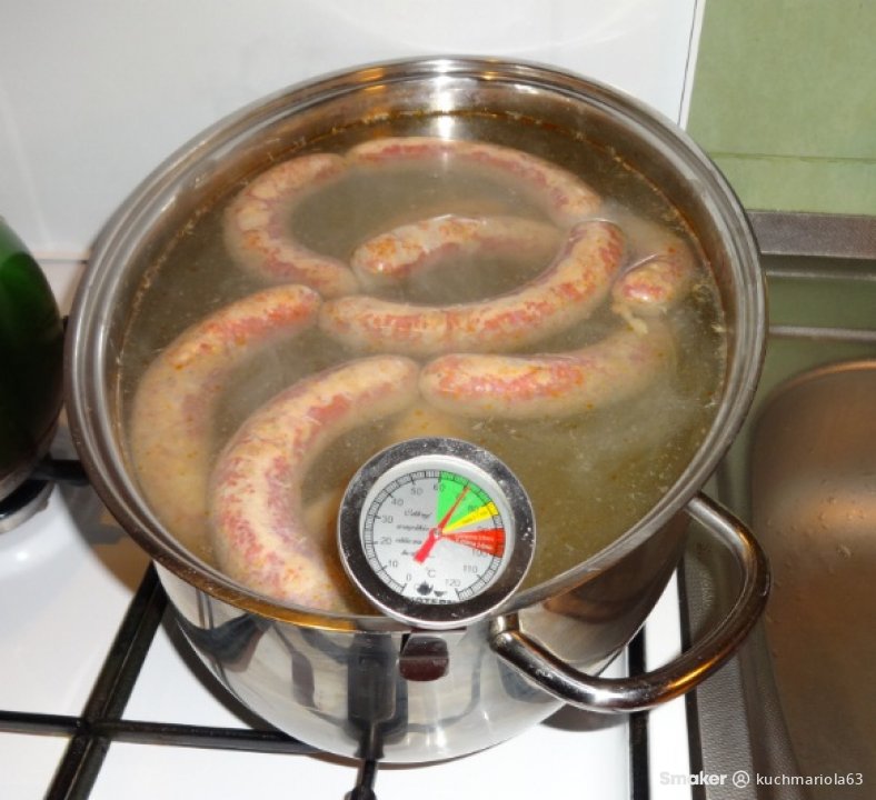 Jeżeli chcemy sparzyć kiełbasę, to parzymy w 75 stopniach Celsjusza przez 20 minut.