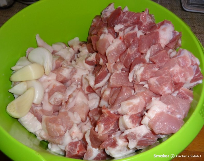 - karczek wieprzowy 1 kg, schłodzony i pokrojony w 2 cm kostkę