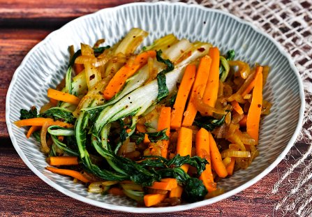 Marchew obieramy i kroimy w słupki, cebulę kroimy w piórka. Pak choi kroimy na pół, wycinamy twardy głąb, a resztę kroimy wzdłuż w paski. Na oleju przesmażamy warzywa - najpierw marchew, a kiedy lekko zmięknie dodajemy do niej cebulę, miód i chilli. Smażymy, często mieszając, aż cebula się zeszkli. Dodajemy pak choi i przykrywamy pokrywką. Co jakiś czas mieszamy, ale delikatnie, aby kapusta się nie rozpadła. Pak choi będzie miękki po około 3 minutach. Przed podaniem posypujemy jeszcze płatkami chilli lub, jeśli wolicie bez dodatkowej ostrości, to np. sezamem.