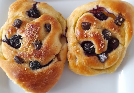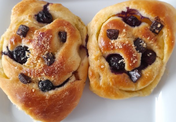 Podzielić na 6 części , lekko spłaszczyć i ułożyć na blaszce wyłożonej papierem do pieczenia. W miejsca zwinięcia ciasta włożyć borówki i kostki czekolady. Tak postępować do wyczerpania składników.