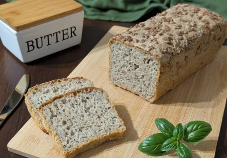 Następnego dnia do miski z zaczynem dodać letnią wodę wymieszaną z cukrem i drożdżami, wymieszać. Następnie wsypać mąkę pszenną, sól, siemię lniane, ziarna i olej, ponownie wymieszać, żeby wszystkie składniki się połączyły. Przełożyć ciasto do keksówki nasmarowanej masłem i posypanej mąką. Wierzch posmarować wodą i posypać słonecznikiem. Nakryć ściereczką i odstawić do wyrośnięcia. Chleb powinien podrosnąć do brzegów foremki. Mój chlebek rósł 2 godziny.