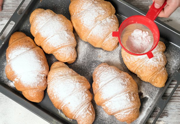 Upieczone rogaliki drożdżowe po włosku oprósz cukrem pudrem. Podawaj w towarzystwie ulubionego dżemu bądź kremu.