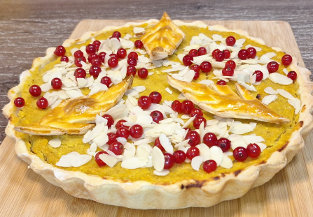 Dekoracja: wyjmij tartę z piekarnika, lekko ostudź i udekoruj świeżą czerwoną porzeczką oraz płatkami migdałów Najlepiej podawać z bitą śmietaną.